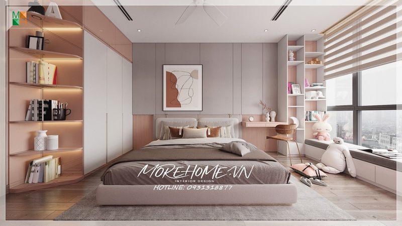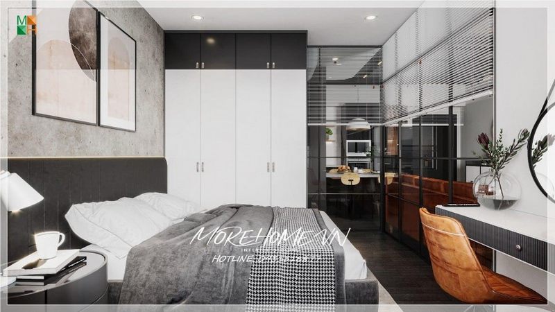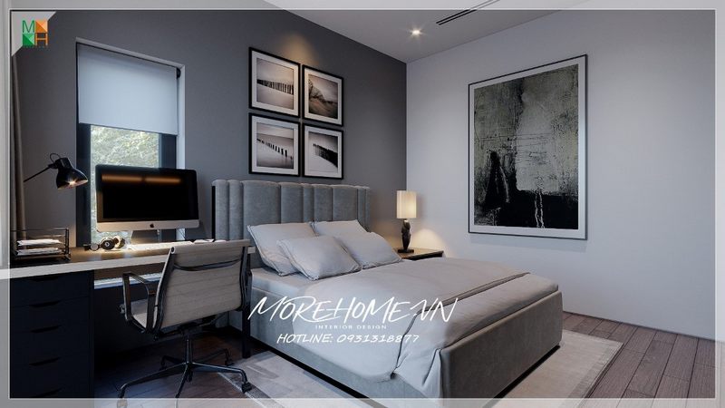 Giường ngủ hiện đại với đầu giường bọc nệm điểm nhấn cho chiếc giường ấn tượng cho phòng ngủ chung cư. Bên trên đầu giường được treo tranh canvas đơn giản nhưng khá phù hợp với màu sắc của phòng.