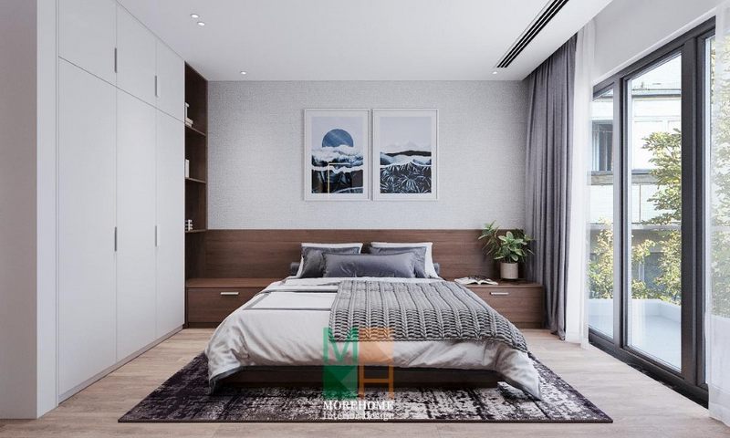 Bức tường giảm bớt được sự thô cứng khi KTS lựa chọn gỗ ốp tường kết hợp tranh canvas trang trí sinh động cho phòng ngủ
