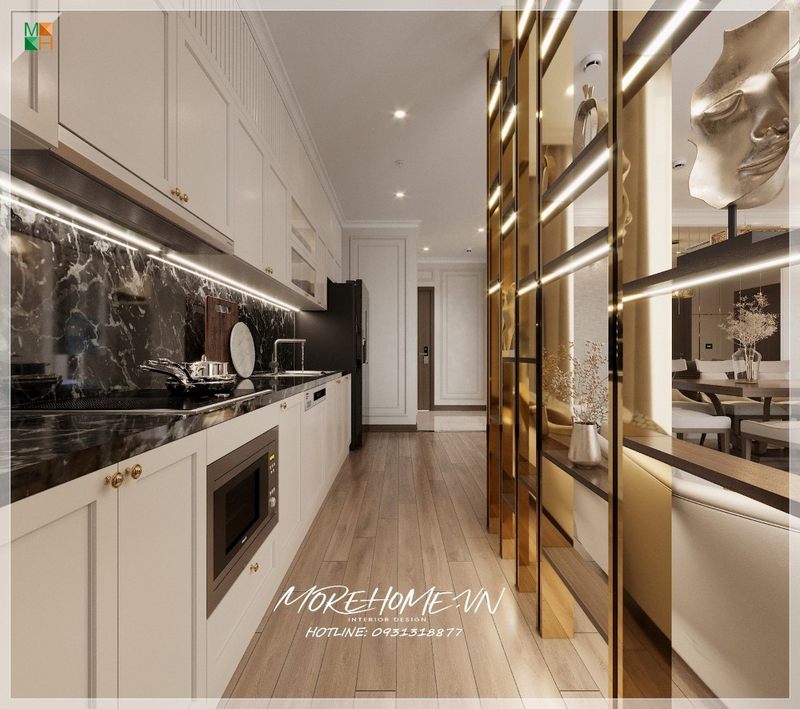 Thiết kế phòng bếp chung cư tách biệt hoàn toàn với không gian sinh hoạt chung khác, đồng thời vẫn đảm bảo tính tiện nghi và đồng nhất cho cả không gian sống của gia chủ