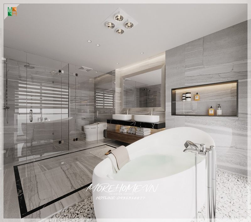 Mẫu thiết kế nhà tắm đẹp với nội thất, thiết bị vệ sinh được lựa chọn giản giữ cho không gian căn phòng tiết kiệm điện năng.