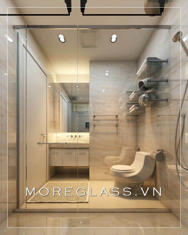 Chung cư được trang bị một phòng tắm nhỏ với sử dụng vách kính nhà tắm để tách riêng không gian tắm và khu vệ sinh, giúp cung cấp cho căn phòng tắm tiện nghi hơn.