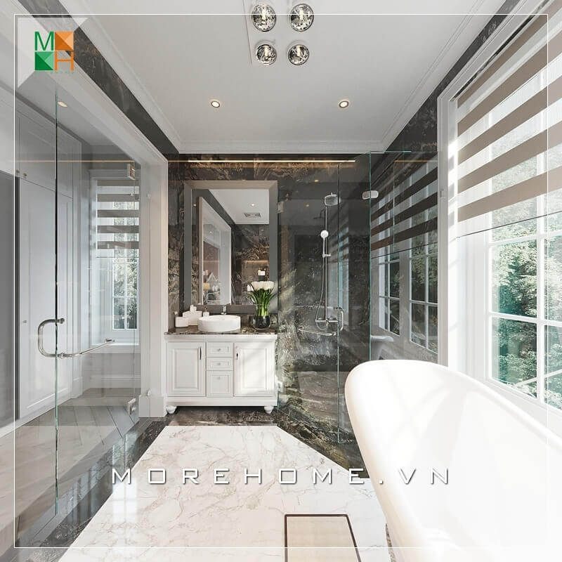 Mẫu thiết kế nội thất phòng tắm hiện đại được sử dụng chủ yếu tone màu trắng để tạo nên sự sang trọng và tinh tế cho các không gian nhà phố, biệt thự, chung cư.